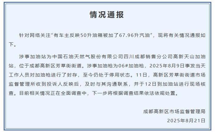 8月21日,成都高科技区市场监督和管理局向互联网上报告了以下信息:“汽车所有者报告说,将67.96升的燃料添加到了50升的燃油箱中”。涉及的加油站是中国石油和天然气有限公司的四川成都销售分支的高科技天汉加油站,位于成都高科技区的Fangcaojie街。涉及的燃油枪是06#的燃油枪。在2025年8月9日事件发生的那天,工作人员密封了加油枪,但仍被使用。 11日,高科技区收到了申诉人的报告,市场管理和法格卡街的管理,并及时与他联系,并在12日前往加油站进行现场检查。相关情况目前正在全面调查中,根据调查结果的结果,将根据法律和法规面临圣置步骤在。